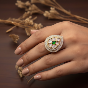 Emerald Teardrop Kundan Cocktail Ring- Adjustable